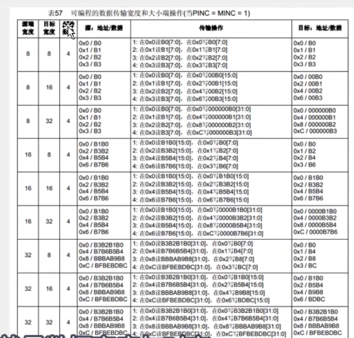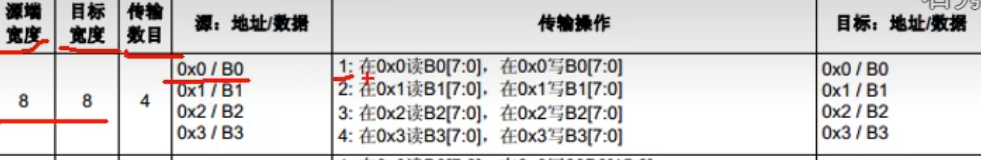 当源端和目标都是八位时,转运第一步,再源端0的位置,读取数据B0,再目标的0位置写入数据B0。就是把B0从左面移动到右面。之后就是B1,B2,B3。