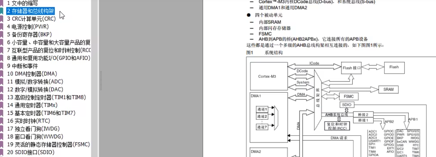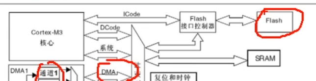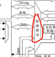 主动单元这里内核有DCode和系统总线。可以访问右边的存储器,其中Dcode总线是专门访问Flish的。系统总线是访问其他东西的。另外由于DMA要转运数据,所以DMA必须要有访问的主动权。