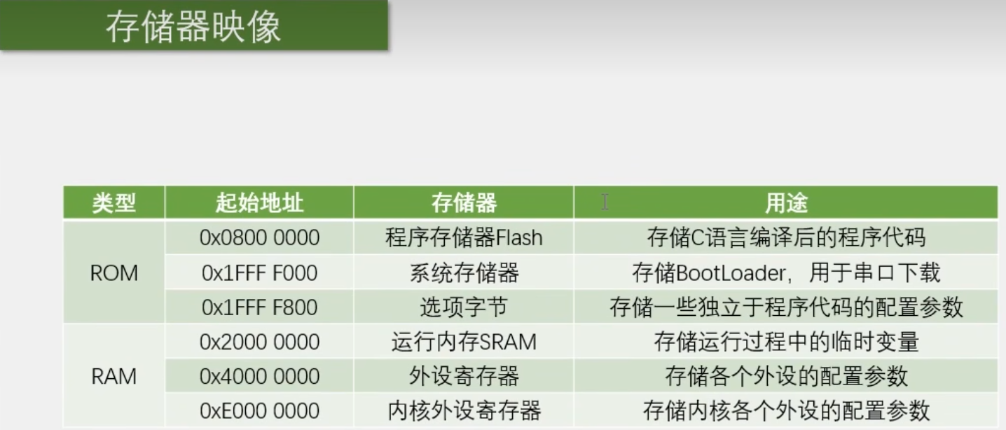 其中ROM分为了3快,第一块是程序存储器Flash,也就是主闪存他的用途就是存储C预言编译后的代码,也就是我们下载程序的位置,一般运行程序,也是从主闪存里面执行的