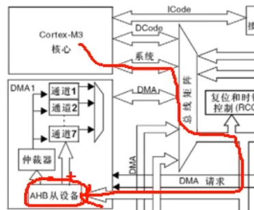 另外在总线矩阵这里也会有一个仲裁器如果DMA和CPU都要访问一个目标,那么DMA就会暂停CPU的访问,防止冲突。不过总线仲裁器仍然会保持CPU得到一半的总线带宽,使CPU也能正常工作。