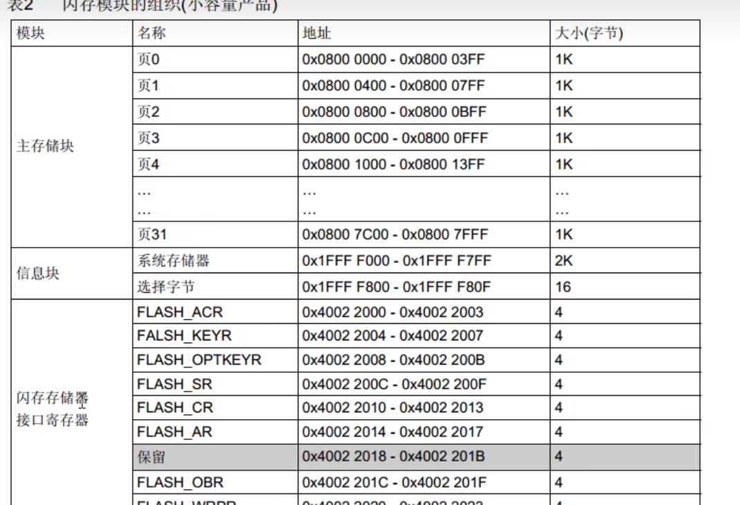然后就是闪存。下面的闪存接口寄存器地址是0x400开头的,说明是外设的一部分。这个外设可以对闪存进行读写。