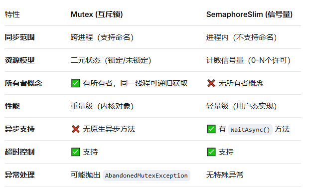 {class Program{static async Task Main(){int pid = Process.GetCurrentProcess().Id;Console.WriteLine($"这里是进程{pid},尝试获取锁");using (var mutex = new Mutex(false, "MySharedResource")){mutex.WaitOne(); // 获取锁try{// 假设在访问共享资源Console.WriteLine($"这里是进程{pid},已获取到锁");Thread.Sleep(100000);}finally{mutex.ReleaseMutex(); // 释放锁Console.WriteLine($"这里是进程{pid},已释放锁");}}Console.ReadLine();}}