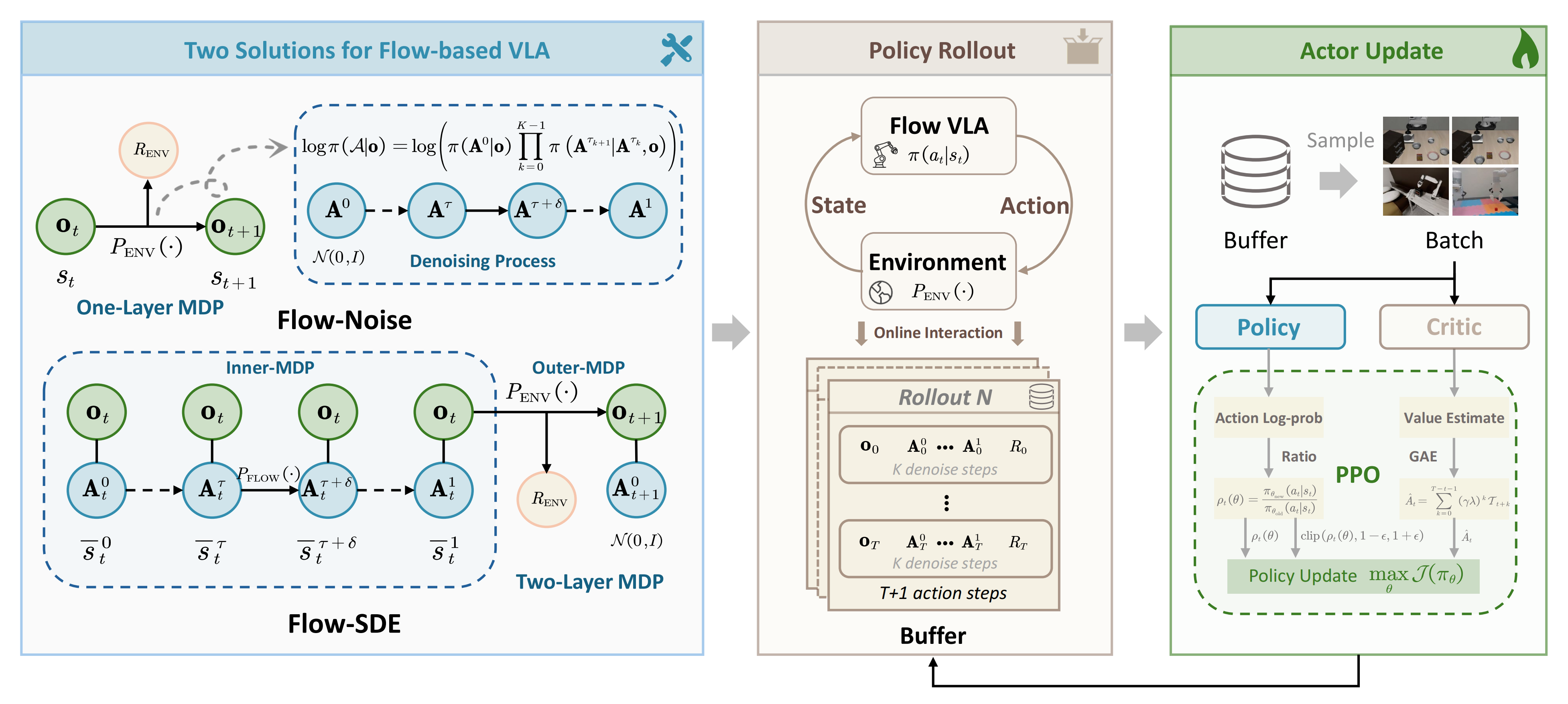 将可学习的噪声网络集成到去噪流程中,并将该阶段建模为离散时间马尔可夫决策过程(MDP),以实现精确的对数似然估计 - Flow-SDE 则将普通微分方程(ODE)去噪流程转化为随机微分方程(SDE),在保证等效边缘分布用于探索的同时,构建了将去噪流程与策略—环境交互耦合的两层 MDP,并配合混合 ODE-SDE 采样技术来加速训练