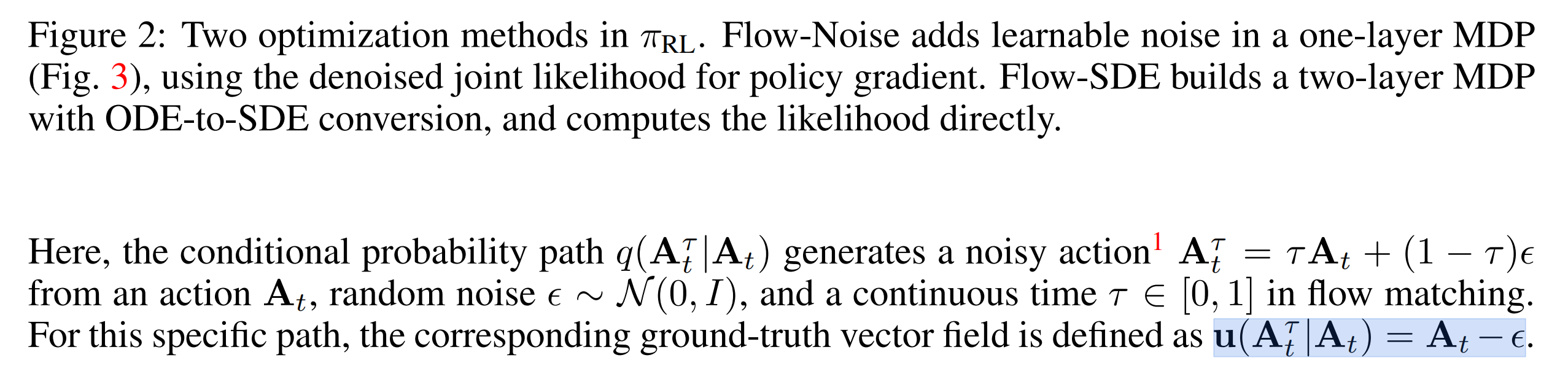 作者在流匹配去噪过程中引入了可学习的噪声网络,并在上文1.3.1节中详述的标准单层 MDP 框架下解决该问题