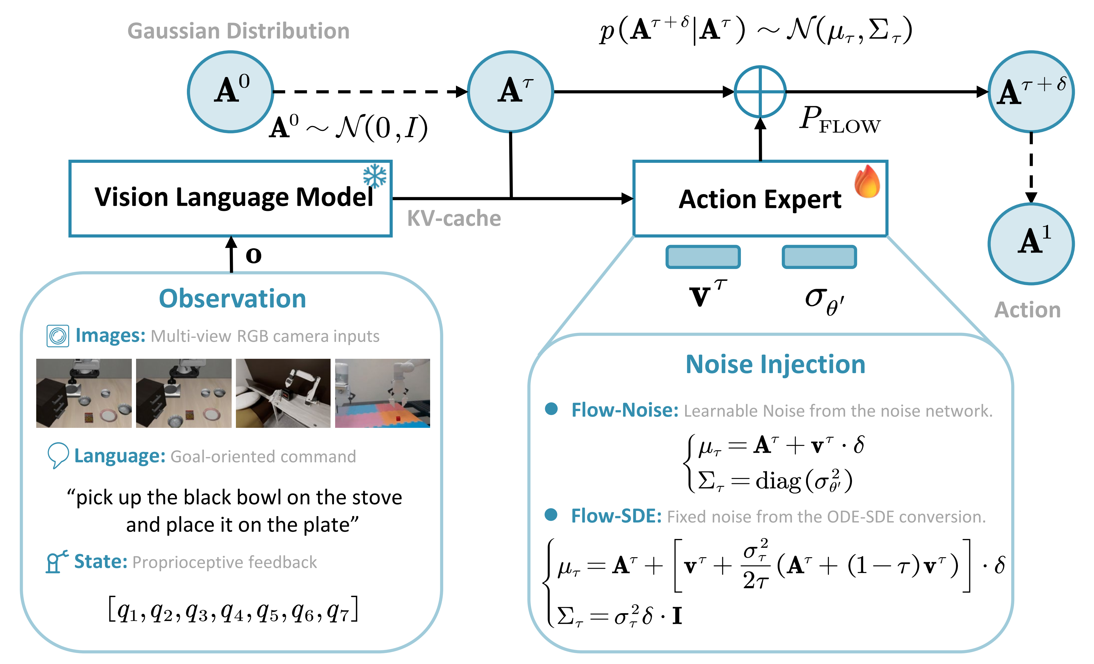 - 上图是展示在流匹配过程中噪声注入的示意图,以π0.5为例,它融合了图像、语言和状态信息,实现了统一的VLM输入