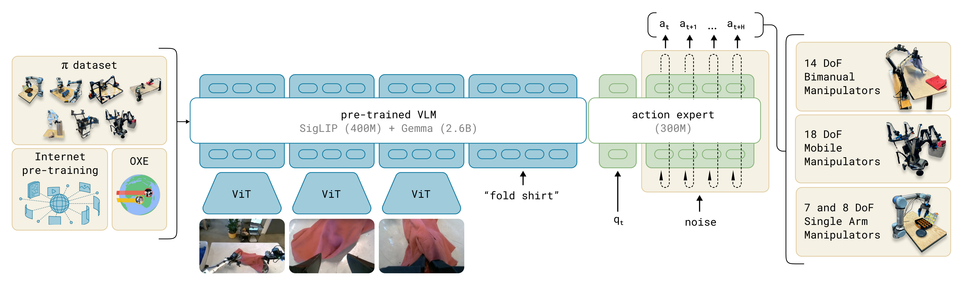 - 在该模型中,VLM 从视觉和语言输入中提取特征,而流匹配专家负责生成动作