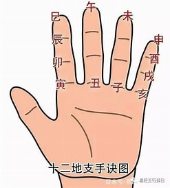 以左手手掌四根手指的指根关节以及指尖承载十二地支,无名指指根关节为起始点(子),顺时针遍历出其他地支。(这只是其中比较推荐一种方式,仅供参考)