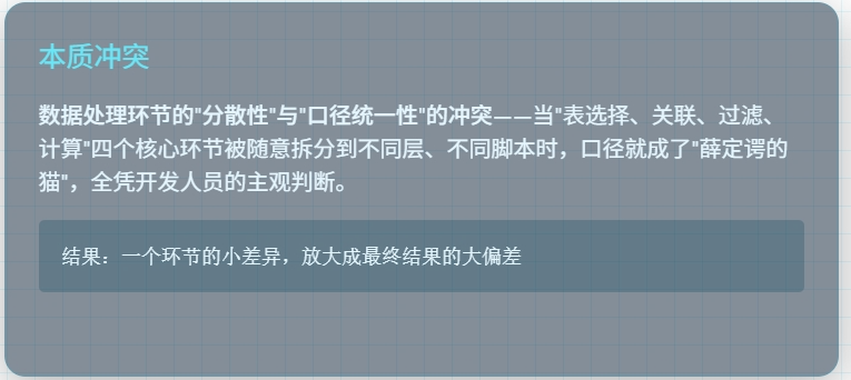 这些问题的本质,不是技术能力不足,而是数据处理环节的“分散性”与“口径统一性”的冲突——当“表选择、关联、过滤、计算”四个核心环节被随意拆分到不同层、不同脚本时,口径就成了“薛定谔的猫”,全凭开发人员的主观判断。