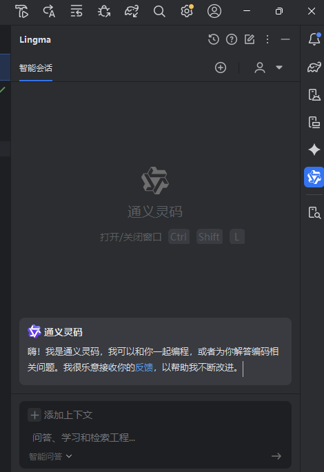 - 登录成功后,通义灵码面板会显示 “登录成功”,并自动加载功能(无需额外配置,默认开启基础功能)。