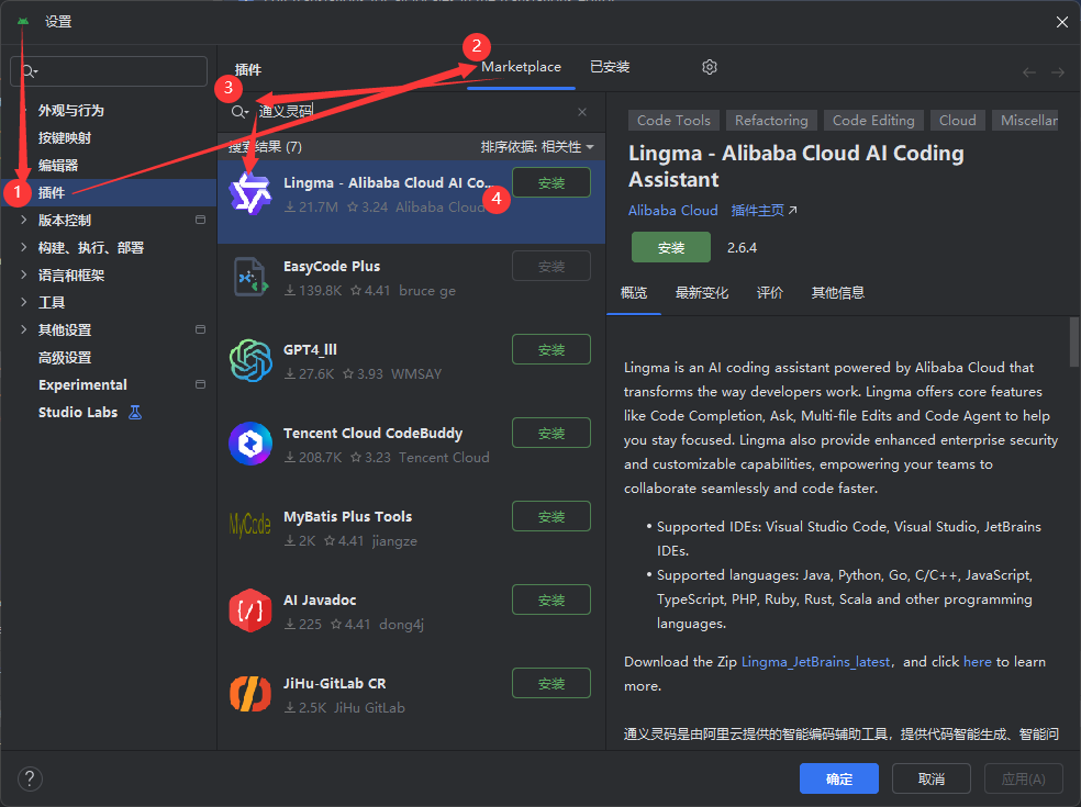 - 顶部搜索框输入「通义灵码」(注意别输错字,也可搜索英文「Tongyi Lingma」);