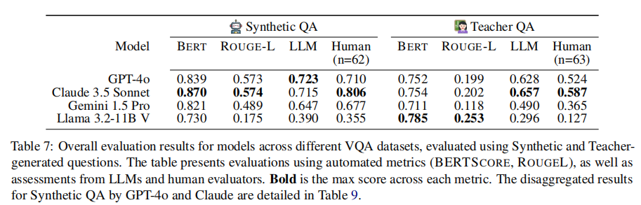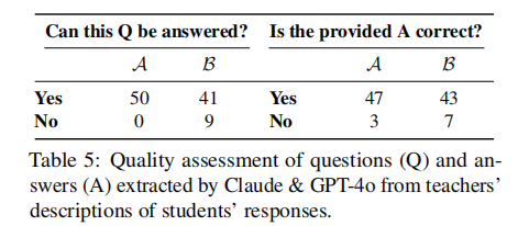 为验证合成QA的有效性,团队邀请两名专业评估者(一名K-12教师、一名教育技术专家)对100个随机样本(GPT-4o和Claude各50个)进行评估,核心指标为“问题可回答性”和“答案正确性”,结果如表5所示。