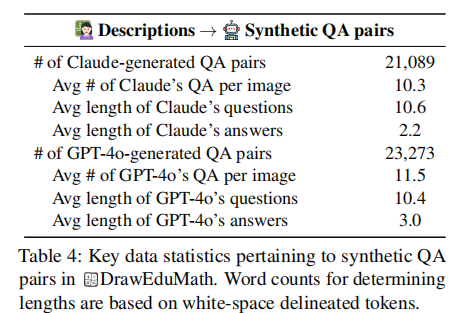 团队使用Claude 3.5 Sonnet和GPT-4o两种模型生成,最终得到44362个合成QA对,是教师QA的3.8倍。合成QA的统计信息如表4所示。