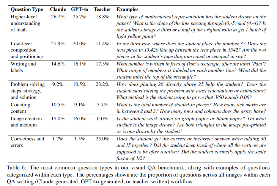 从占比可以看出关键差异:教师更关注“解题策略”(23.2%)和“正确性与错误”(23.0%),这两类问题直接服务于教学反馈;而合成QA更关注“媒介类型”(15%-16%)和“低阶位置”(20%-22%),这类问题更容易从描述中提取。这种差异恰好体现了合成QA的互补性——覆盖教师未关注的基础识别任务。