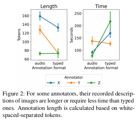 两种方式的对比如图2所示,部分教师的语音标注长度更长、耗时更短。第一轮标注最终产生22.8万字描述,平均每张图像111.1个词。