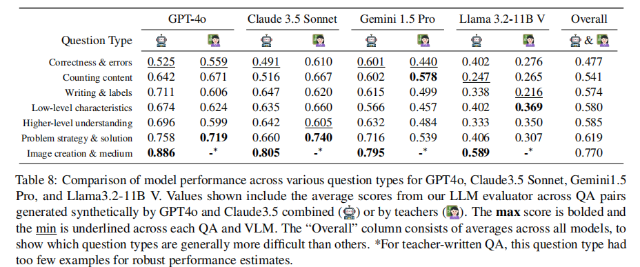 教师QA更具挑战性:所有模型在教师QA上的得分均低于合成QA,尤其是Gemini和Llama,说明教师设计的教育导向问题对VLMs更难。
