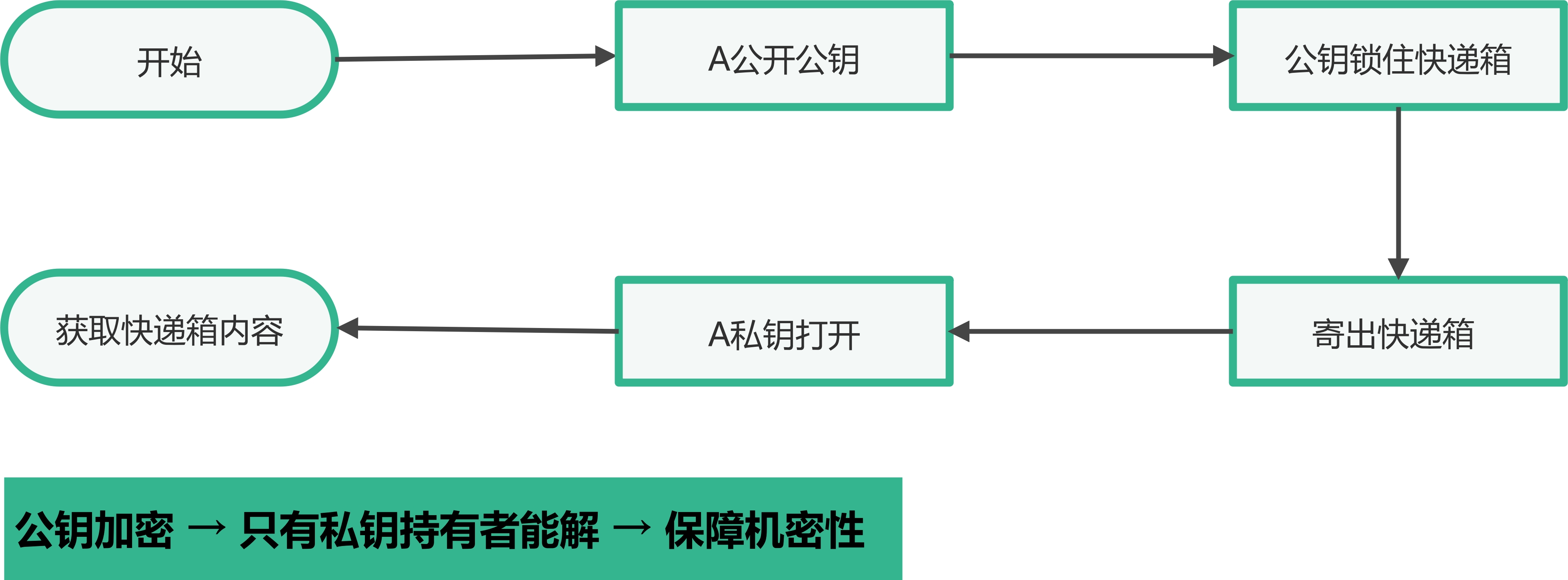 - A 写好信件后,用自己专属的签名封条(私钥)封住包裹;