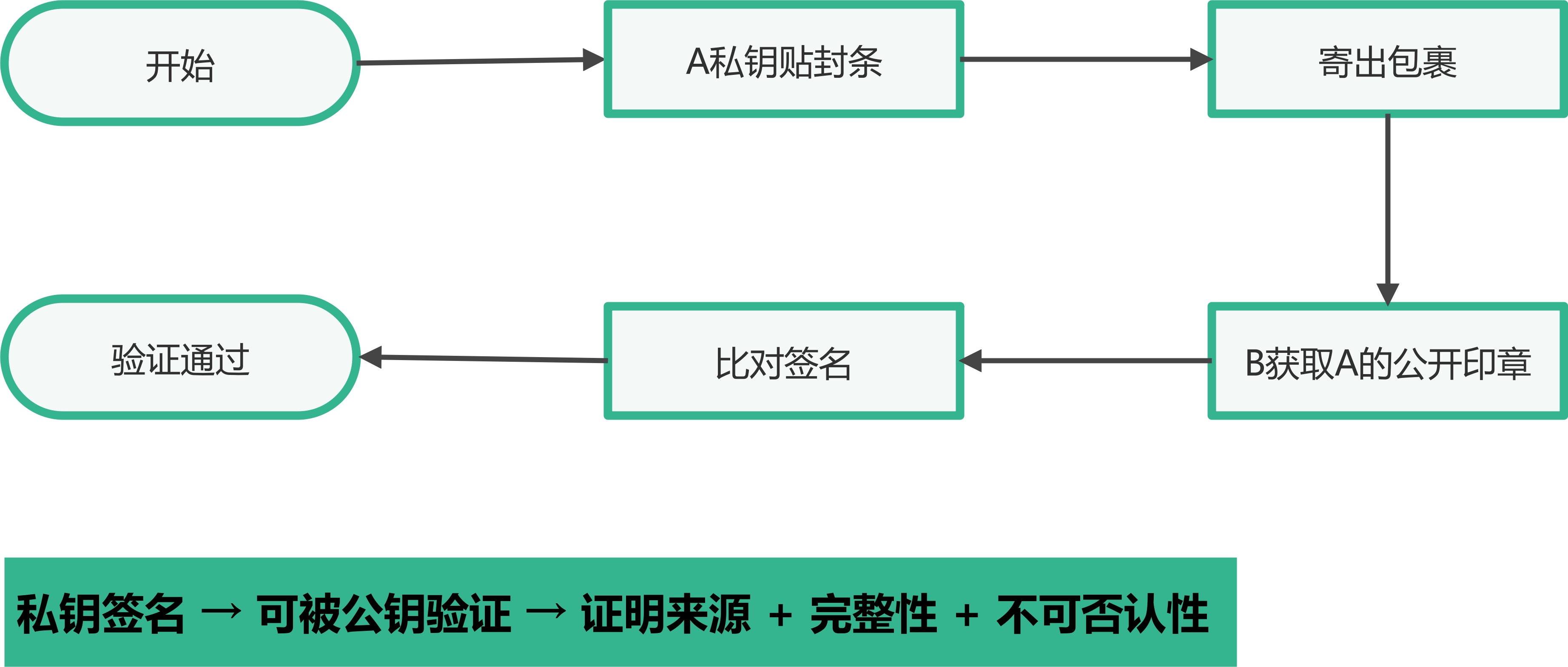 - 如果验证通过,B 可以确定包裹是 A 发出的,内容也没被改过。