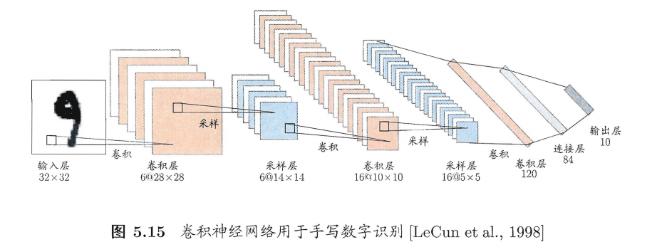 核心思想:使用多隐层网络进行特征学习,自动从数据中提取高层特征。例如,深度信念网络(DBN)用RBM堆叠预训练,卷积神经网络(CNN)用权共享减少参数,如图5.15用于手写数字识别。