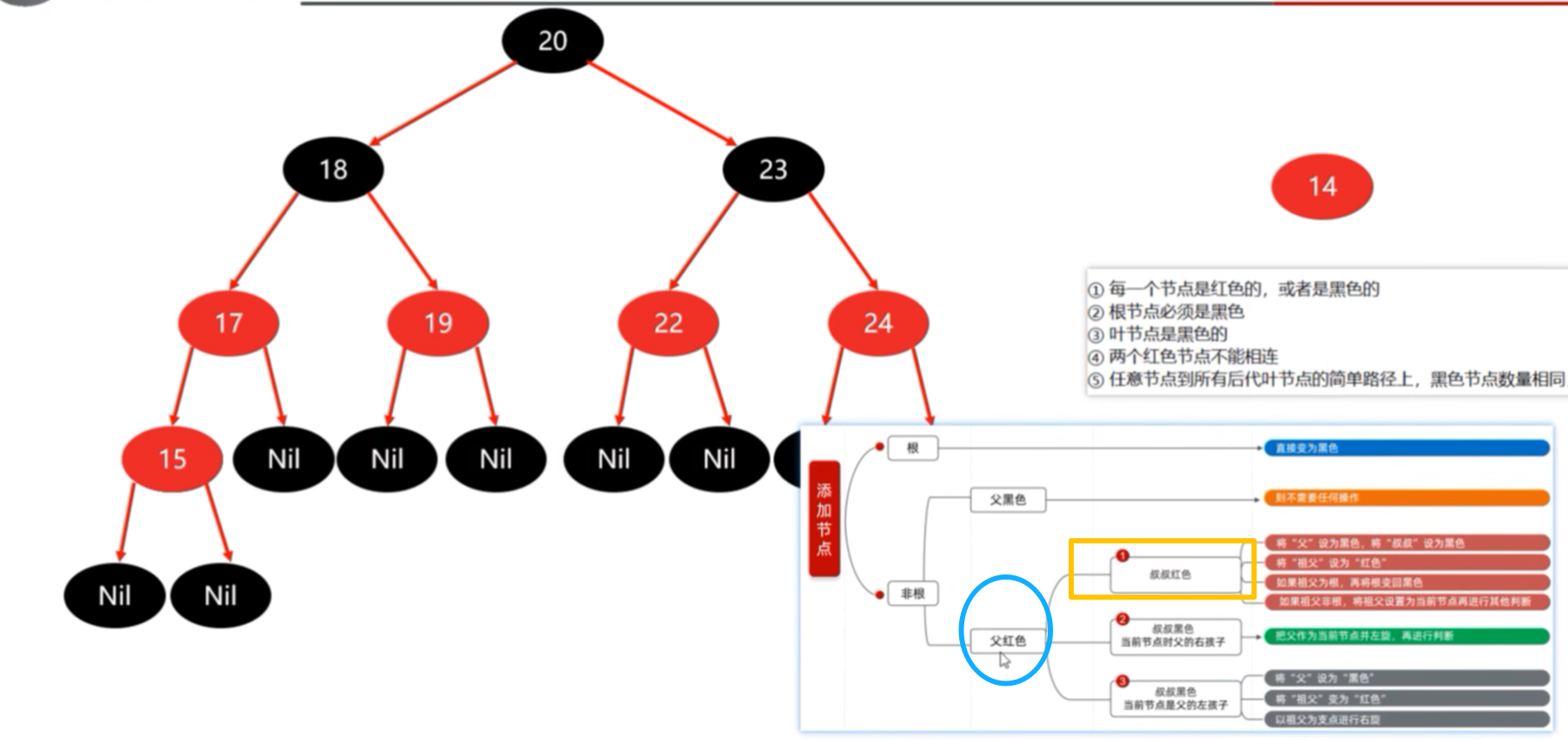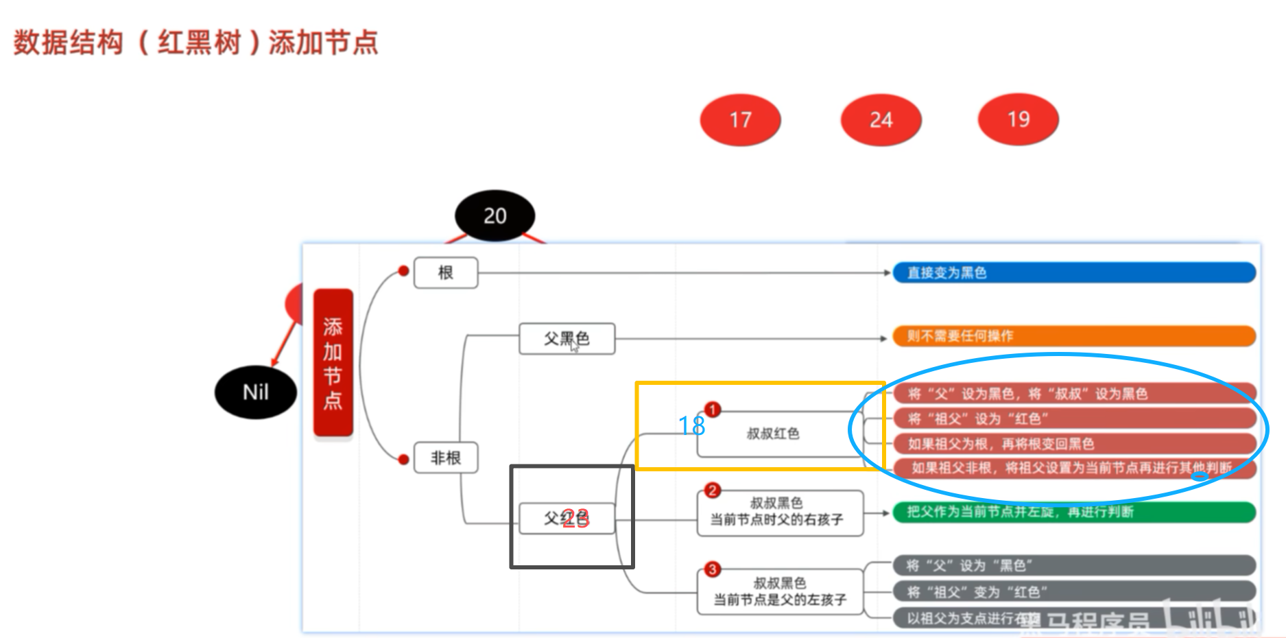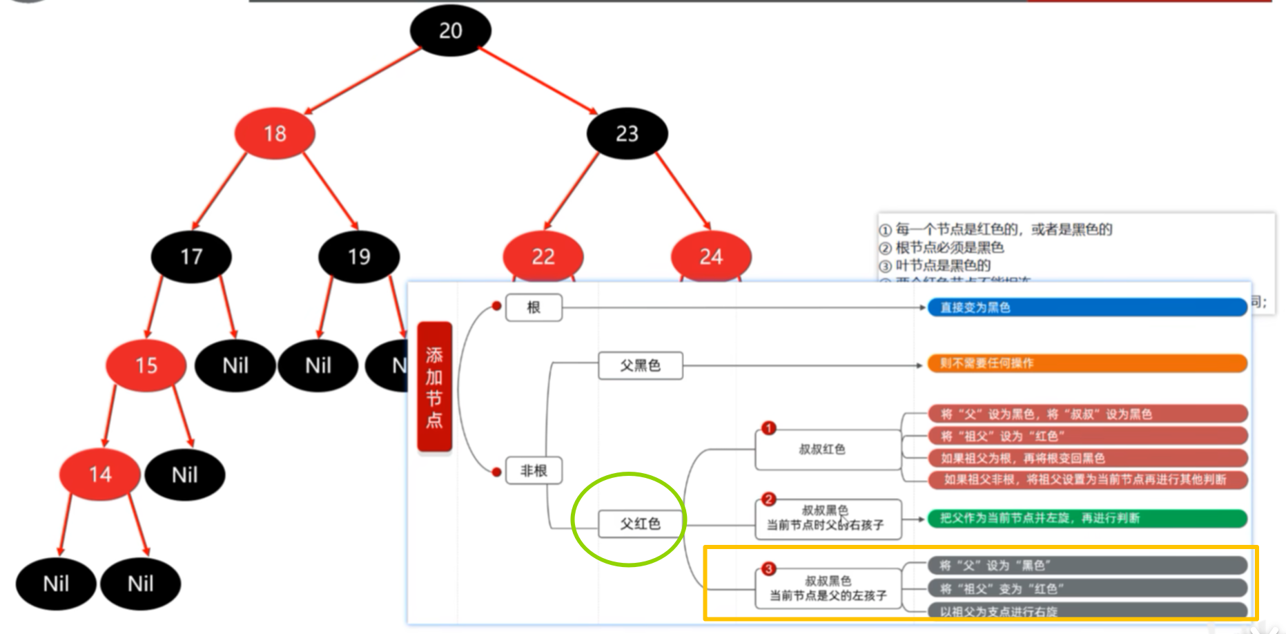 处理方案:①首先需要将“父”23节点设置为黑色,还需要把叔叔节点18设置为黑色;