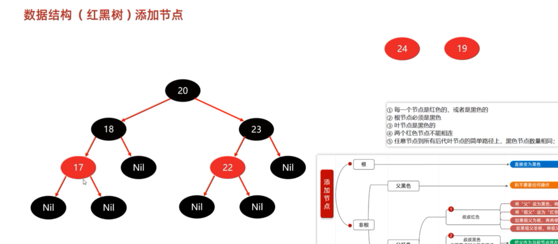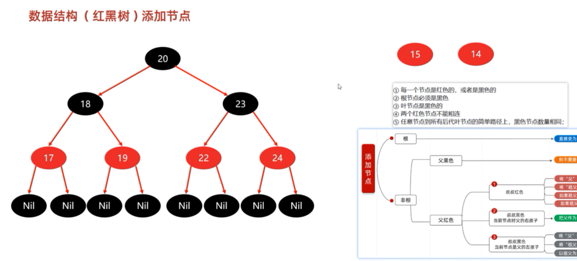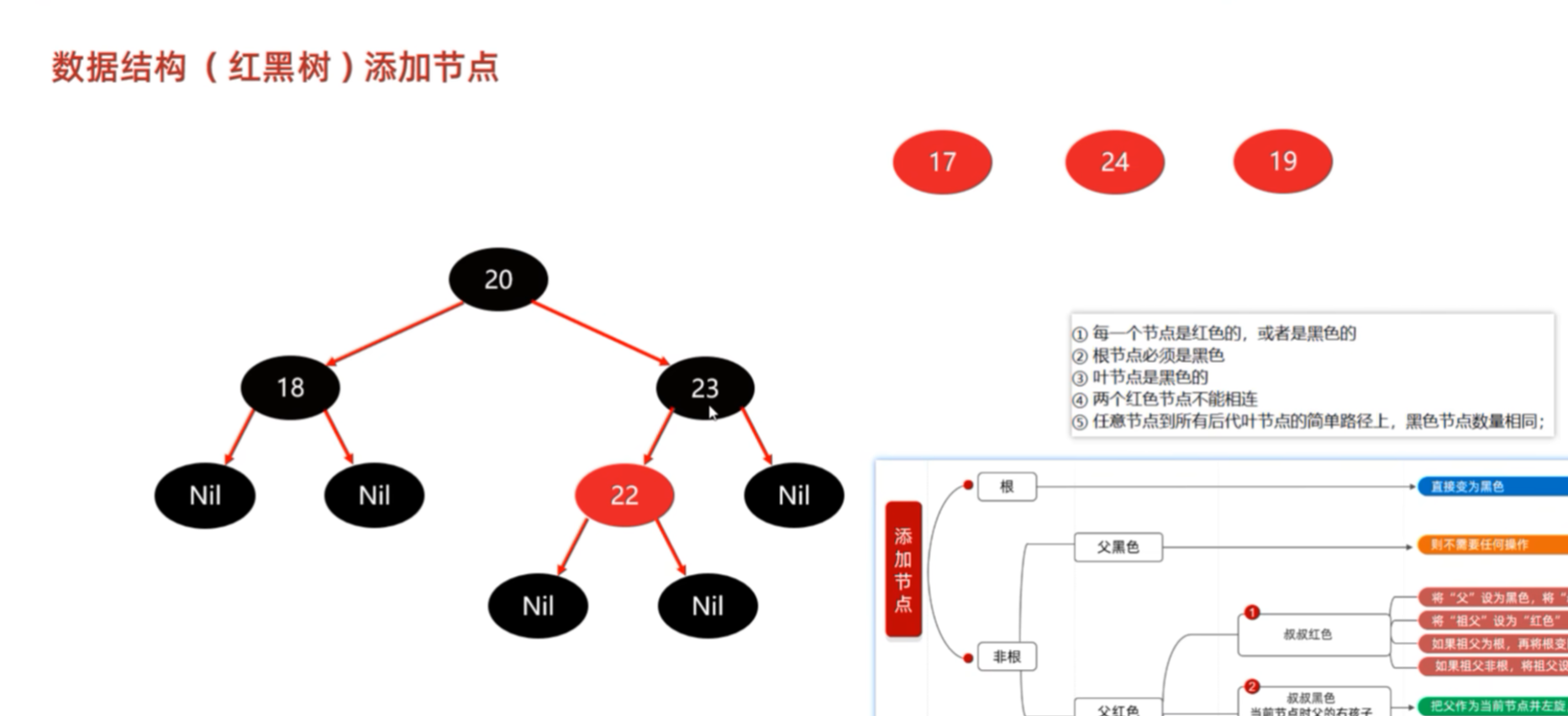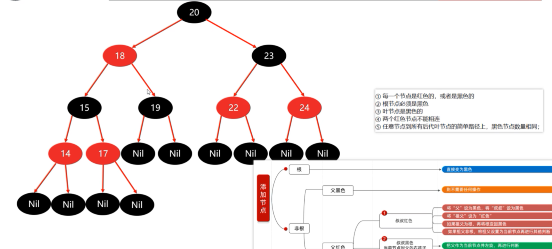 处理方案:①首先需要将“父”23节点设置为黑色,还需要把叔叔节点18设置为黑色;