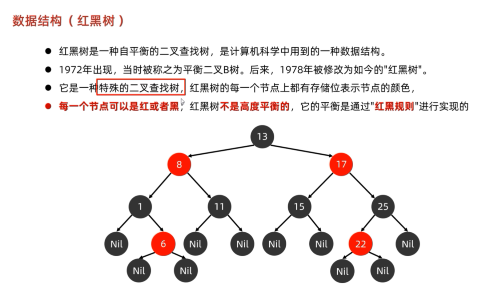 红黑树是一种自平衡的二叉查找树(BST),通过给每个节点附加一个颜色属性(红色或黑色),在插入和删除时通过“变色”和“旋转”来维持近似平衡。