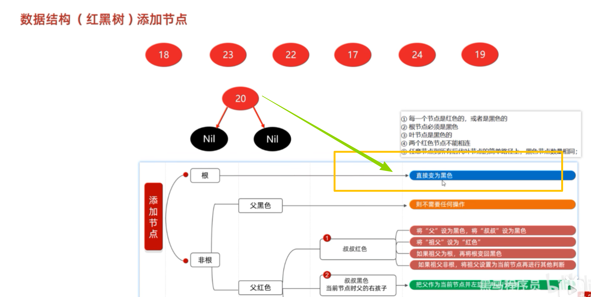 假设添加7个数据,第一次添加20作为根节点,触发违法规则2:根节点必须是黑色的。解决方案:黄色框中的文字。将其变成黑色。