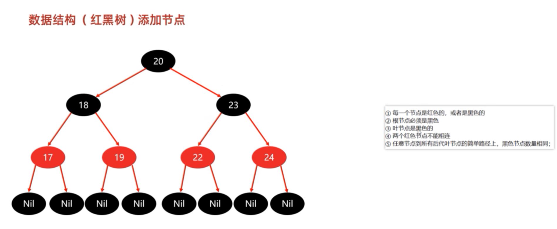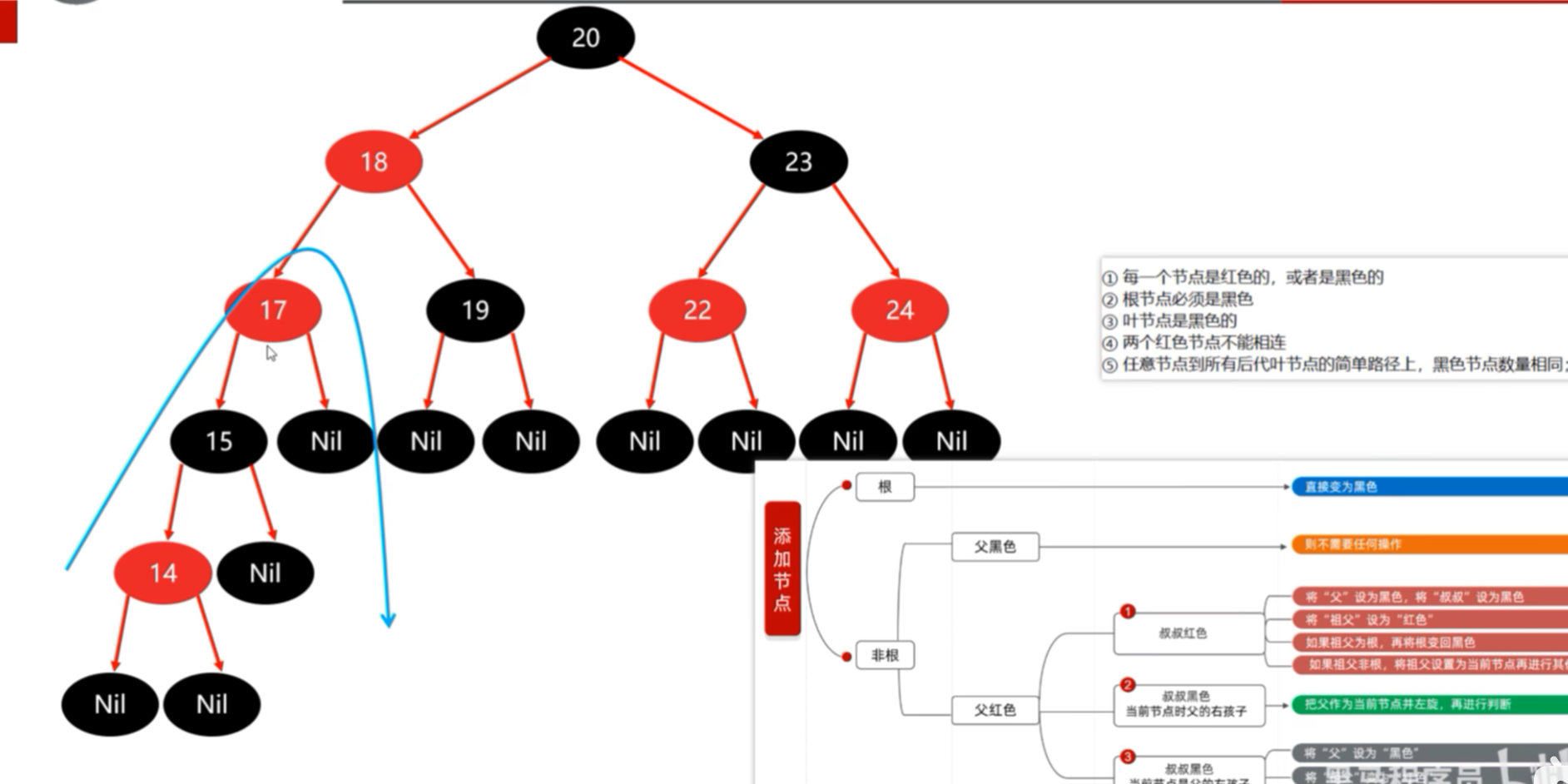 添加17,17比根节点20要小,使其成为左子节点,与其18比较,又成为其左子节点。没有违法任何的红黑树的规则,不需要进行任何的操作。