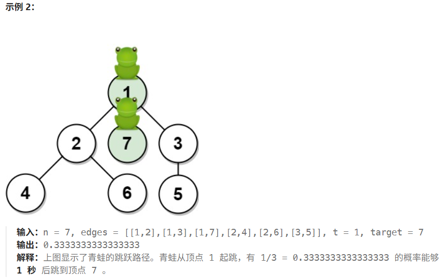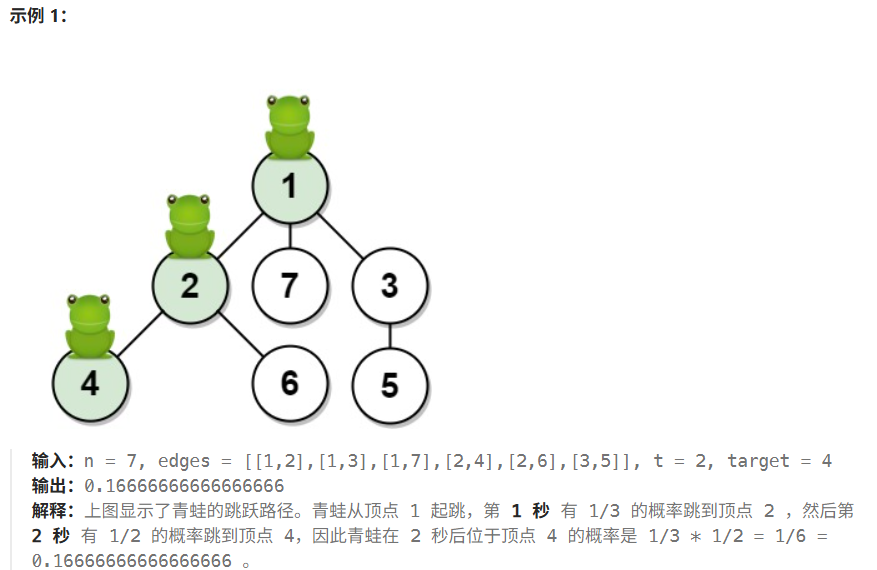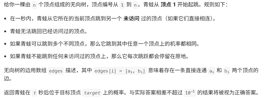 class Solution {private long dfs(List<List<Integer>> graph, int target, int cur, int parent, int time) {//1.没有剩余时间了,如果当前节点就是目标,那么返回1,否则0if(time==0)return cur == target ? 1 : 0;//2.如果还有剩余时间但是当前点就是目标,那么如果这个目标没有孩子节点就返回1,否则0if(cur==target)return graph.get(cur).size() == 1 ? 1 : 0;//3.有时间且还没有找到目标,那么向下递归累乘分母for (int child : graph.get(cur)) {if (child != parent) {long product = dfs(graph, target, child, cur, time - 1);//3.1向下递归只有找到目标才不会返回0,这里说明找到目标,那么就累乘结果if (product != 0) {return product * (graph.get(cur).size() - 1);}}}//4.向下递归没有找到目标直接返回0return 0;}public double frogPosition(int n, int[][] edges, int t, int target) {//1.用无向图构造一棵树List<List<Integer>> graph = new ArrayList<>();for (int i = 0; i <= n; i++) {graph.add(new ArrayList());}graph.get(1).add(0);//给根节点添加一个虚拟头节点for (int[] edge : edges) {int u = edge[0];int v = edge[1];graph.get(u).add(v);graph.get(v).add(u);}//2.dfs求结果的分母乘积long product = dfs(graph, target, 1, 0, t);//3.如果是0说明目标不能在限定时间内刚好到达或者不存在return product == 0 ? 0 : 1.0 / product;}