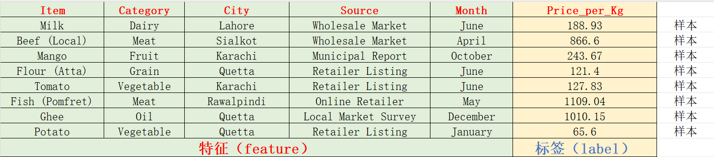 现在有这样一个任务,科学家收集了 50万条 巴基斯坦的食物价格数据,想要借助此数据来预测各个食物的每公斤价格,其中部分数据如下所示: