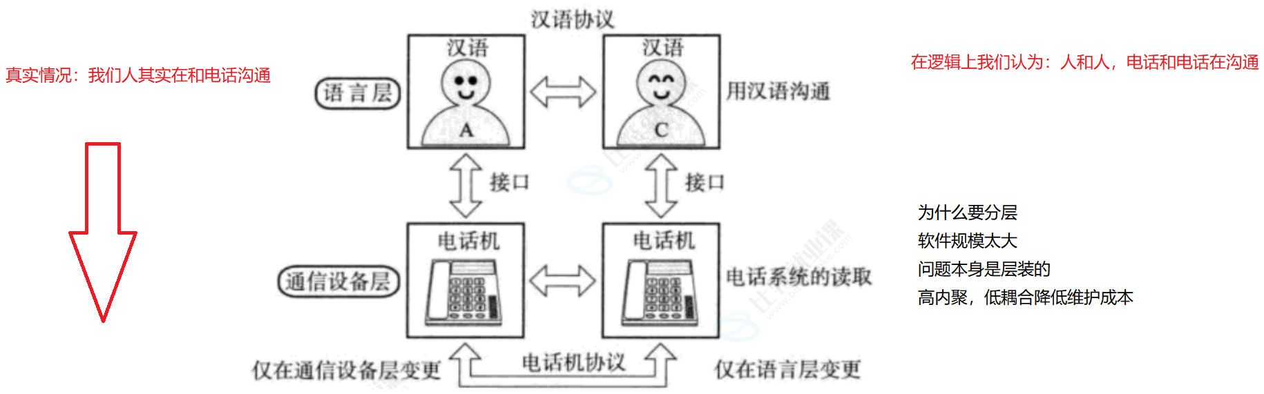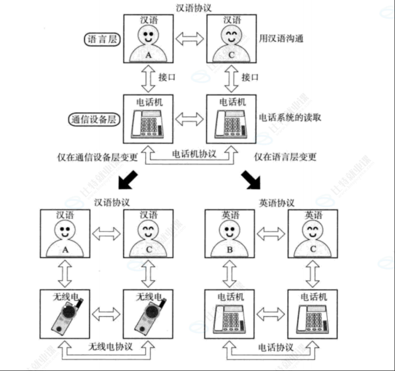 - 在这个例子中,我们的"协议"只有两层:语言层、通信设备层。