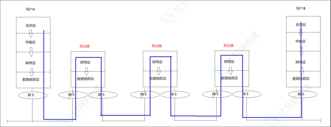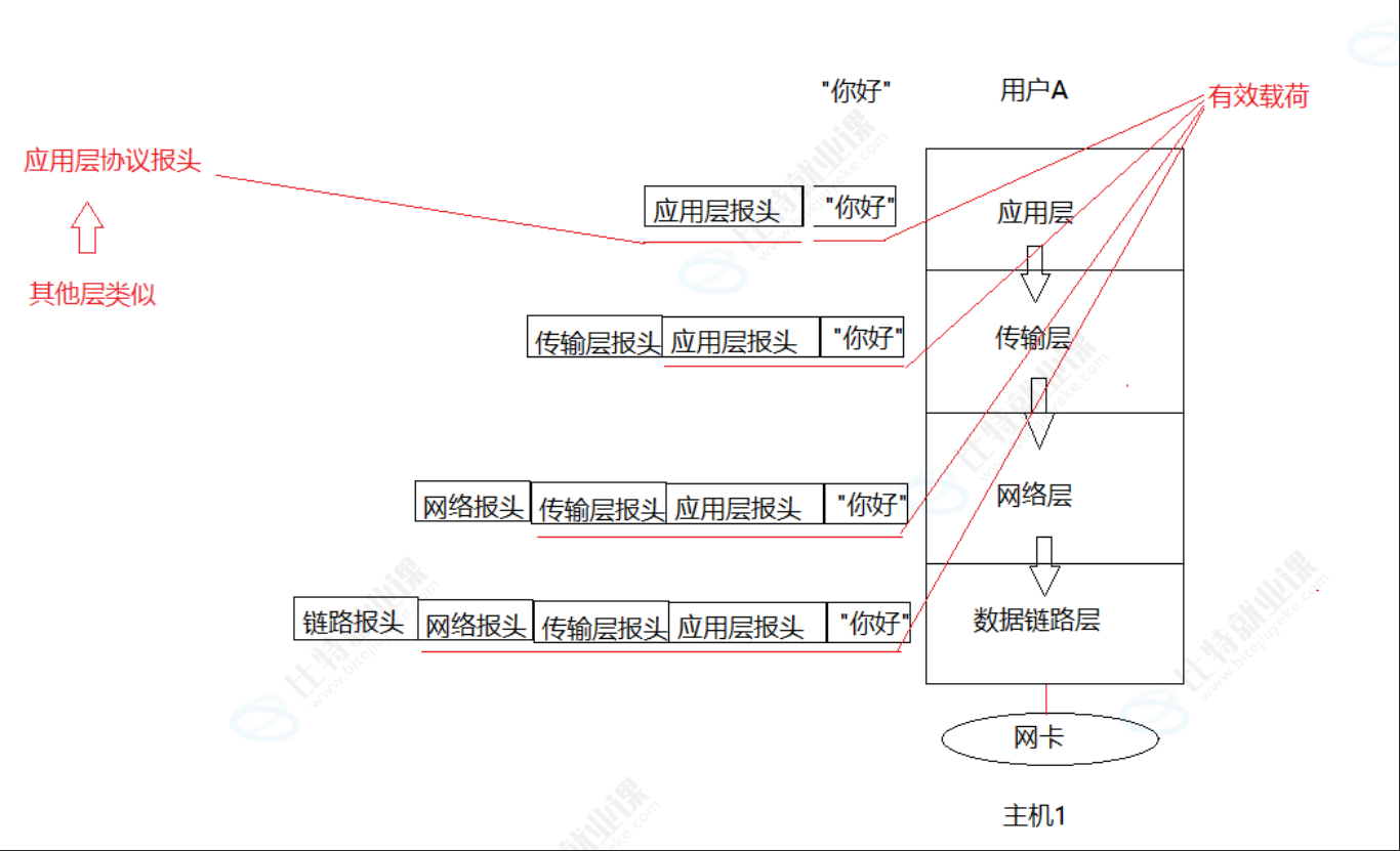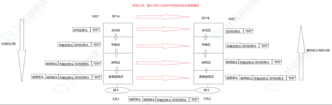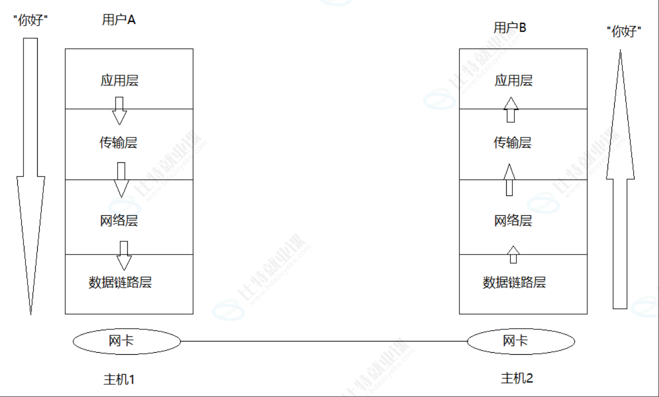 在网络传输的过程中,数据不是直接发送给对方主机的,而是先要自顶向下将数据交付给下层协议,最后由底层发送,然后由对方主机的底层来进行接收,再自底向上进行向上交付,下面是一张示意图。