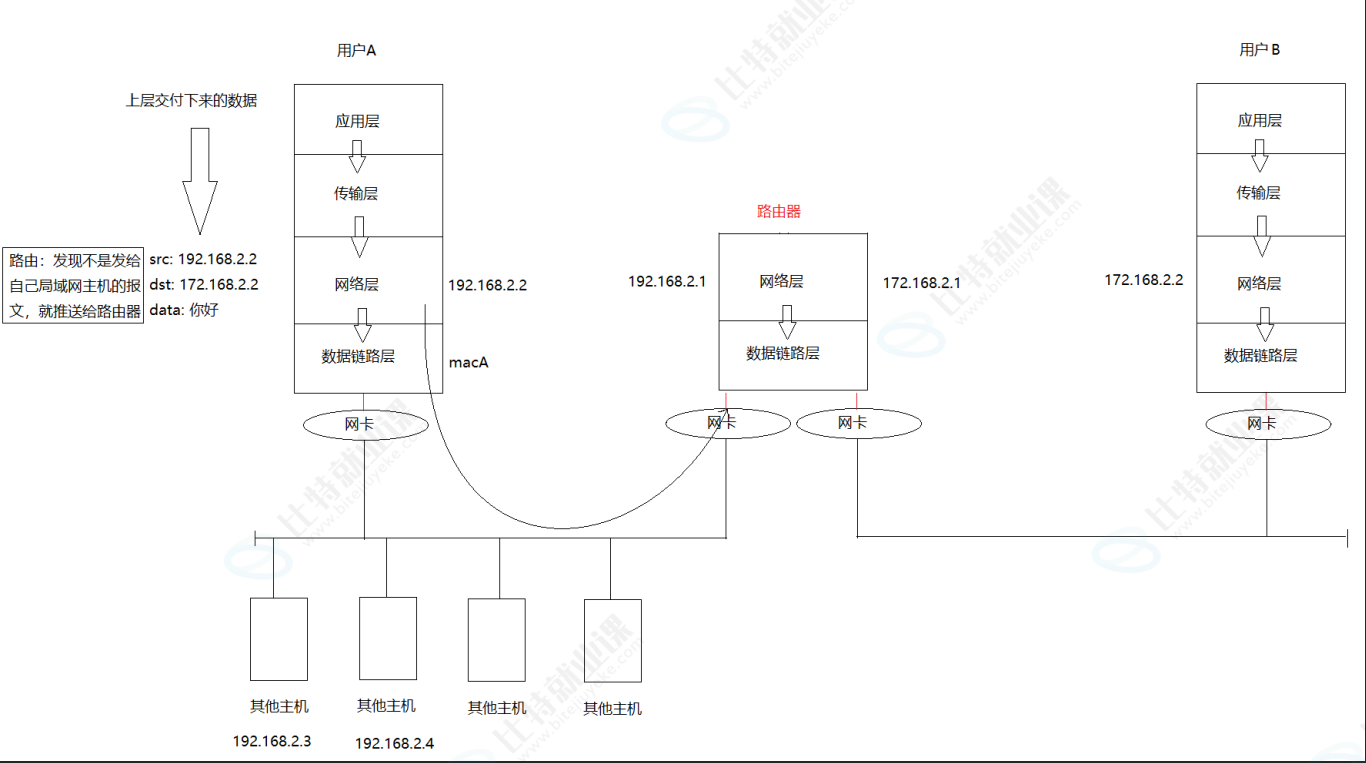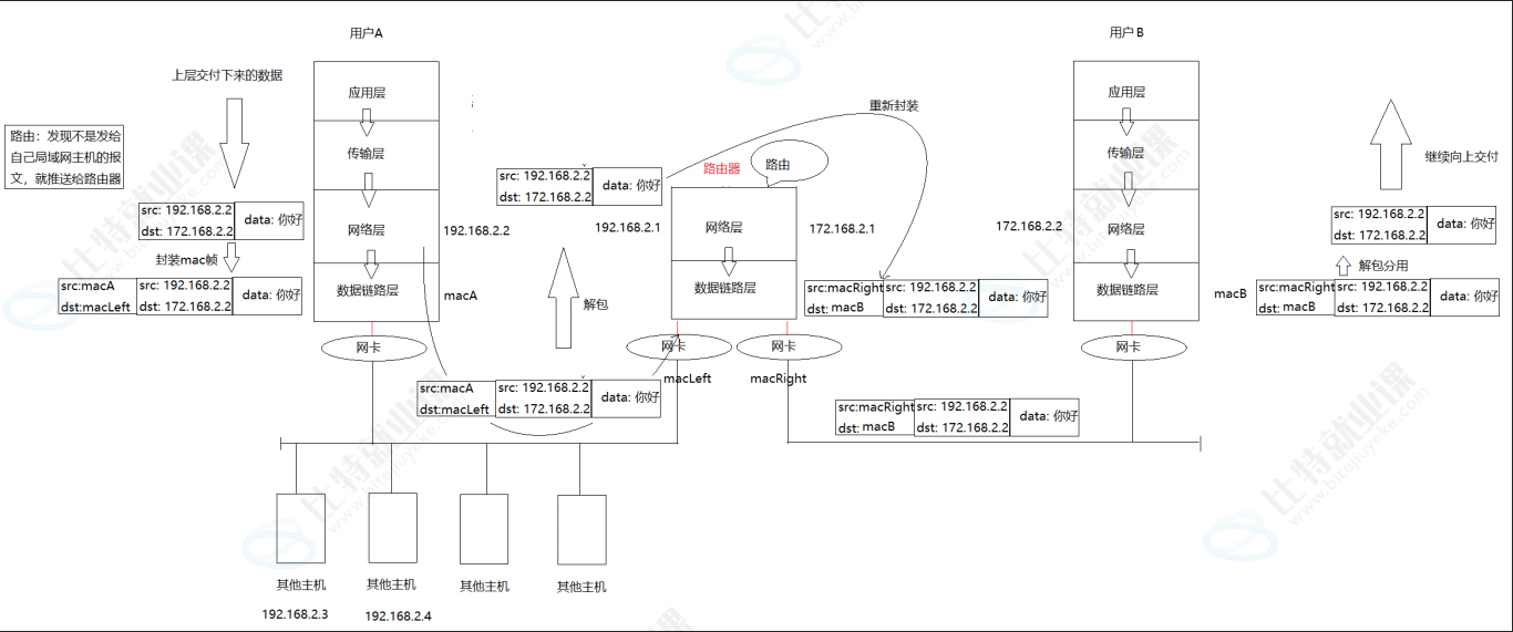 当需要跨网络进行传递的时候,也就是意味着需要找到该数据包的下一跳的MAC地址,所以认为从发送方出来,首先先到到达本网段的路由器,所以获取本网段的路由器的MAC地址