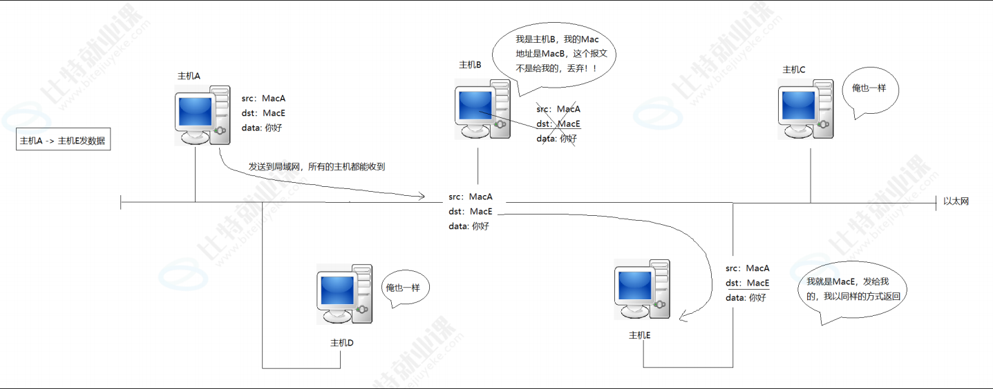 后面我们详细谈论数据链路层的时候,会谈 mac 帧协议,此处我们做一个了解即可。