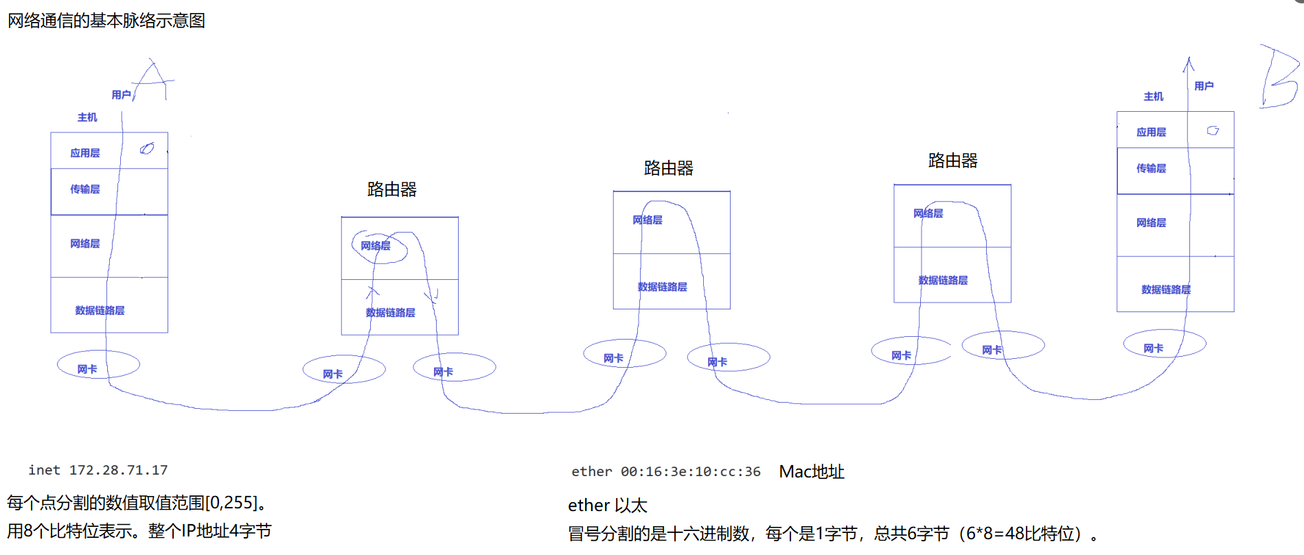 - 网络层:负责地址管理和路由选择。例如在IP协议中,通过IP地址来标识一台主机,并通过路由表的方式规划出两台主机之间的数据传输的线路(路由)。路由器(Router)工作在网络层。
