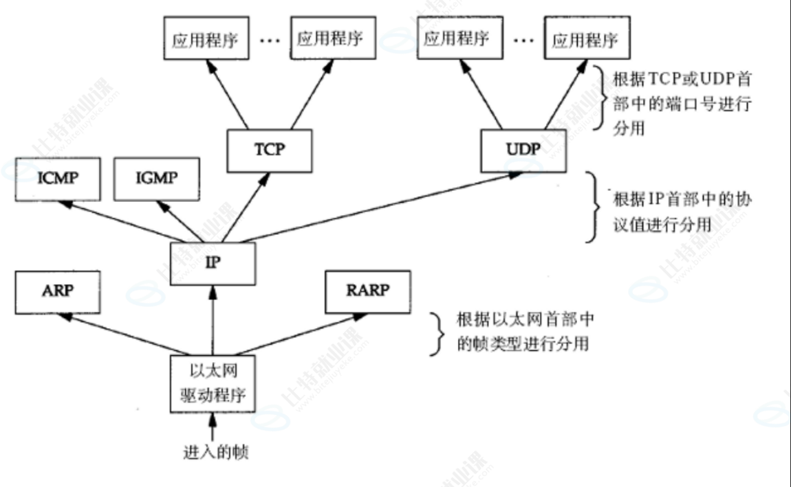 - 数据封装成帧后发到传输介质上,到达目的主机后每层协议再剥掉相应的首部,根据首部中的"上层协议字段"将数据交给对应的上层协议处理。