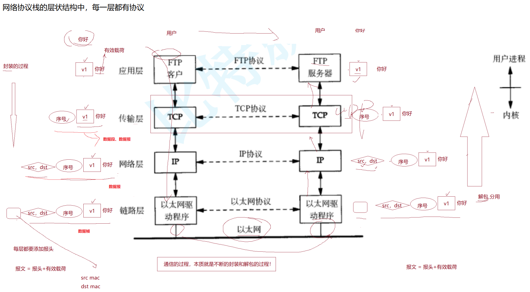 而其中每层都有协议,所以当我进行上述传输流程的时候,要进行封装和解包