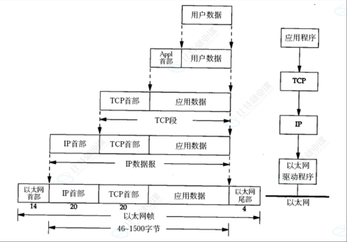 - 应用层数据通过协议栈发到网络上时,每层协议都要加上一个数据首部(header),称为封装(Encapsulation)。