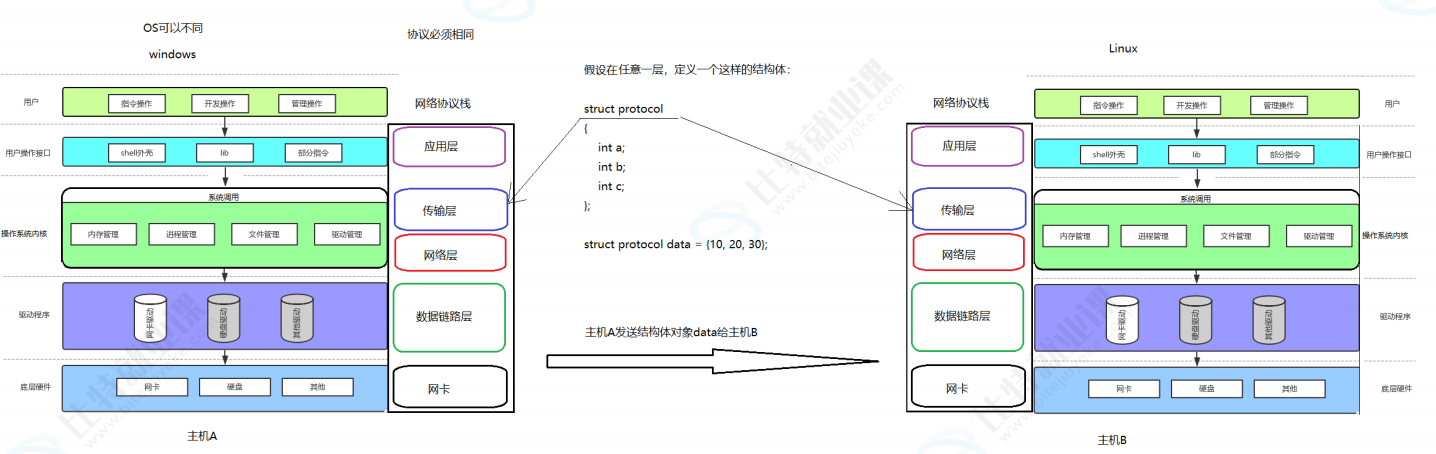 - 首先,即便是单机,你的计算机内部,其实都是存在协议的,比如:其他设备和内存通信,会有内存协议。其他设备和磁盘通信,会有磁盘相关的协议,比如:SATA,IDE,SCSI等。只不过我们感知不到罢了。而且这些协议都在本地主机各自的硬件中,通信的成本、问题比较少。