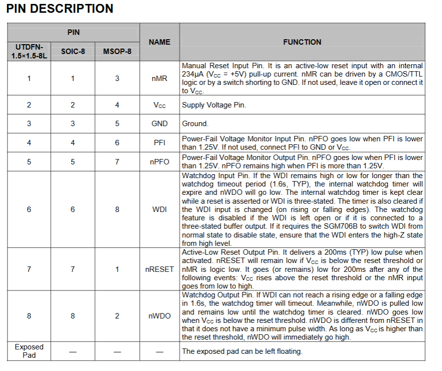| UTDFN-1.5×1.5-8L | 8 | nWDO | 看门狗输出引脚。若 WDI 在 1.6s 内无电平跳变,看门狗定时器超时,nWDO 拉低,直到定时器清零才恢复高电平;当 VCC 低于复位阈值时 nWDO 也会拉低。与 nRESET 不同,nWDO 无最小脉冲宽度,只要 VCC 高于复位阈值,nWDO 会立即拉高。 |