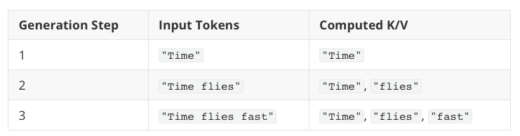 注意其中的冗余:标记“Time”和“flies”在每个新的生成步骤中都会重新计算。KV缓存通过存储和重用先前计算的键值向量来解决这种效率低下的问题: