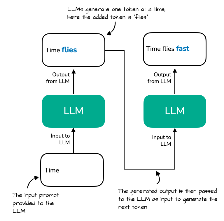 该图展示了 LLM 如何逐个生成文本标记。从提示“Time”开始,模型生成下一个标记“flies”。下一步,对完整的序列“Time flies”进行重新处理,生成标记“fast”。