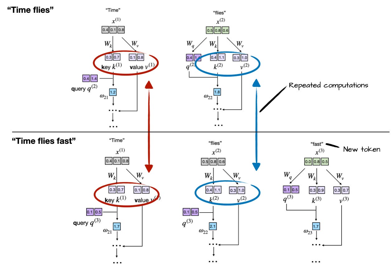 此图展示了 LLM 在每个生成步骤中如何重新计算先前出现的词元(“Time”和“flies”)的键值向量。在生成第三个词元(“fast”)时,模型会再次重新计算相同的键值向量k(1)/v(1),k(2)/v(2)而不是重用它们。这种重复计算凸显了在自回归解码过程中不使用键值缓存的低效性。