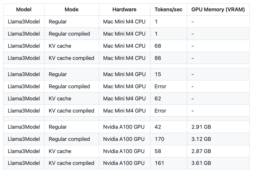 此外,由于我采用了更节省内存的torch.cat方式来动态创建张量,我将 KV 缓存移到了模型之外,以便编译模型,torch.compile从而提高计算效率。