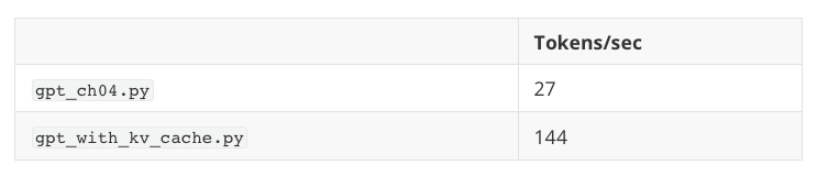 更重要的是,两种实现gpt_ch04.py方式gpt_with_kv_cache.py生成的文本完全相同。这说明键值缓存的实现是正确的——索引错误很容易导致结果不一致。