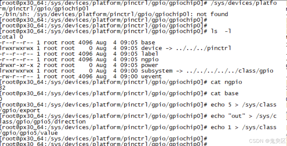echo 5 > /sys/class/gpio/export # 导出成功后,会生成对应的操作节点:/sys/class/gpio/gpio5