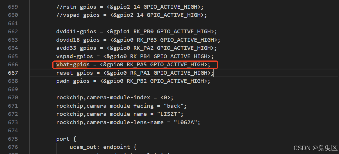 比如,需要将红框内的gpio 信号拉高,通过dts文件可以知道该pin是gpio0 这个控制模块内,pin 的编号是RK_PA5, 激活状态是高。