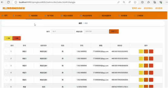 管理员的商家管理页面是电器商城管理系统中的关键功能之一,用于管理平台上的所有商家信息。页面展示了每个商家的基本信息,包括账号、商家名称、性别、手机号、邮箱和身份证号码等。管理员可以通过搜索框快速查找特定商家,也可以通过“添加新商家”按钮新增商家账户,并对商家进行必要的资料填写和审核。