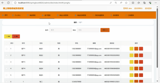 管理员的用户管理页面是电器商城管理系统的核心功能之一,主要用于查看和管理系统中的所有用户信息。页面以表格形式展示每个用户的基本信息,如账号、姓名、性别、手机号、邮箱和身份证号码等。管理员可以通过搜索框快速查找特定用户,也可以点击“编辑”按钮修改用户资料,或点击“删除”按钮将用户从系统中移除。
