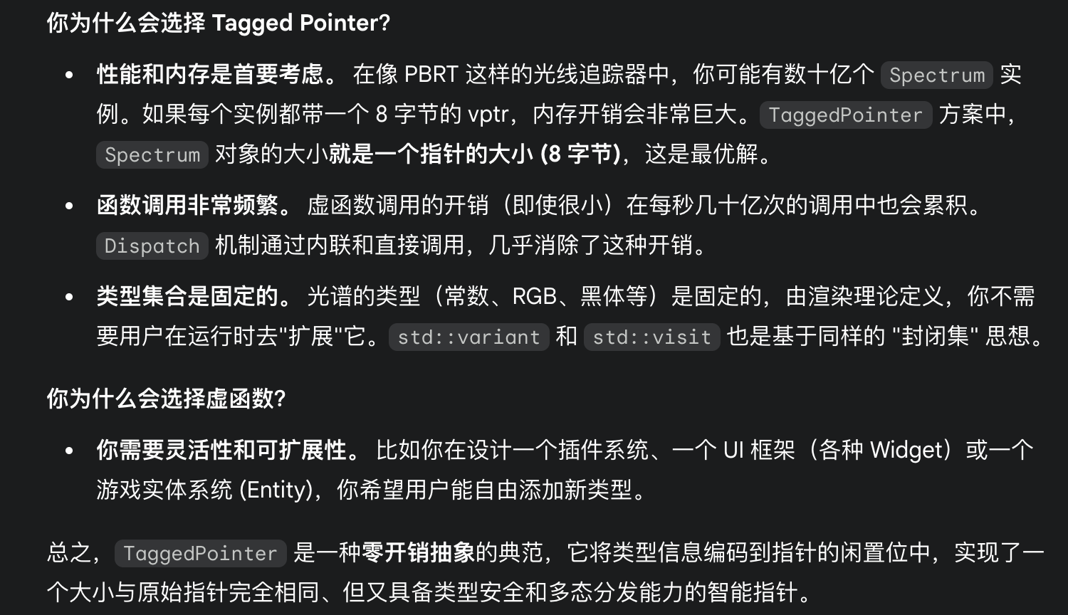 这个主要是我们实际上就是去根据下面的方式定义这个“基类”,我们初始化这个Spectrum指针,继承TaggedPointer,对应的就会继承他的所有的字段。这里的字段中就会保存一个地址,在bits的低位,然后高位可以得到对应的类型。