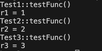 {Test1 test1;Test2 test2;Test3 test3;Test t1(&test1);int r1 = t1.testFunc();std::cout << "r1 = " << r1 << std::endl;Test t2(&test2);int r2 = t2.testFunc();std::cout << "r2 = " << r2 << std::endl;Test t3(&test3);int r3 = t3.testFunc();std::cout << "r3 = " << r3 << std::endl;return 0;